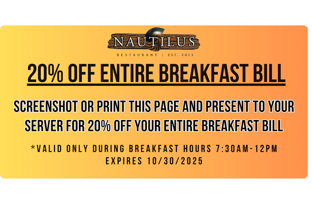 Nautilus boasts Virginia Beach's absolute best seafood including Alaskan snow crab legs. Plus steamed seafood combinations including crab legs, shrimp, clams, and oysters. We also offer hand cut choice steaks, signature crab cakes, pasta dishes and many other hand crafted dishes that you can enjoy on our new open air patio. Come and enjoy a light appetizer and ice cold beer while overlooking Atlantic Avenue or even a romantic dinner under the stars. Whatever you're looking for, let our friendly staff at Nautilus give you the perfect dining experience.