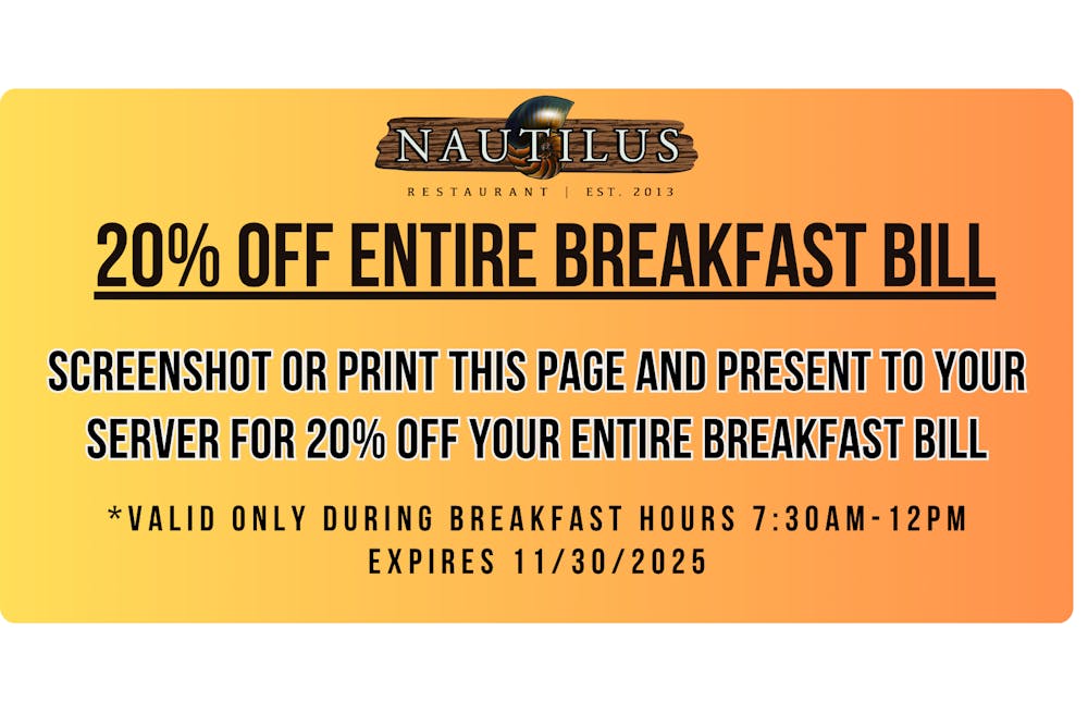 Nautilus boasts Virginia Beach's absolute best seafood including Alaskan snow crab legs. Plus steamed seafood combinations including crab legs, shrimp, clams, and oysters. We also offer hand cut choice steaks, signature crab cakes, pasta dishes and many other hand crafted dishes that you can enjoy on our new open air patio. Come and enjoy a light appetizer and ice cold beer while overlooking Atlantic Avenue or even a romantic dinner under the stars. Whatever you're looking for, let our friendly staff at Nautilus give you the perfect dining experience.